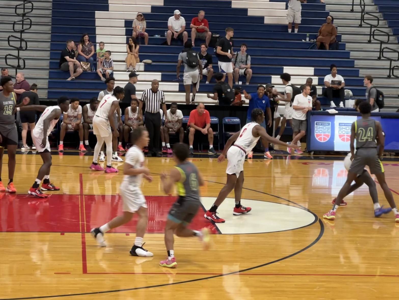 Right at tipoff, you absolutely cannot help but notice the 6’10” Derik Queen (Montverde Academy) of Team Thrill. Spoiler alert, Team Thrill became the eventual champion and Queen went for 27 points and 16 rebounds in that final game of the tourney. In this game, he just floated around the court looming in the minds of the Mass Rivals and ended with 26 points and 12 boards.